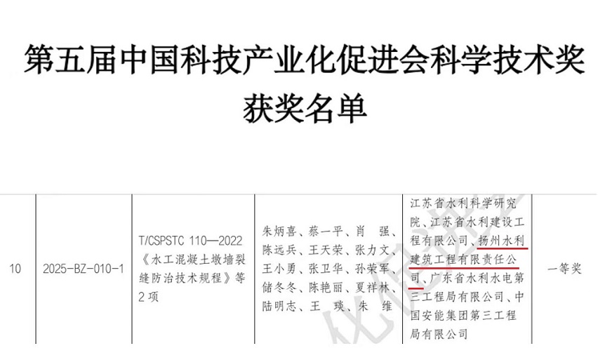 【概要描述】近日,中國科技產(chǎn)業(yè)化促進會公布第五屆科學(xué)技術(shù)獎獲獎名單,揚州水利建筑工程有限責(zé)任公司聯(lián)合江蘇省水利科學(xué)研究院等單位主導(dǎo)編撰的《表層混凝土低滲透高密實化施工技術(shù)規(guī)程》與《水工混凝土墩墻裂縫防治技術(shù)規(guī)程》榮膺標(biāo)準(zhǔn)貢獻獎一等獎,這是公司在標(biāo)準(zhǔn)化建設(shè)領(lǐng)域取得的又一國家級的突破,標(biāo)志著公司在水工混凝土技術(shù)標(biāo)準(zhǔn)制定領(lǐng)域已具備行業(yè)引先地位?! 身椧?guī)程聚焦水利工程建設(shè)中的關(guān)鍵技術(shù)難題,其中,《表層混凝土低滲透高