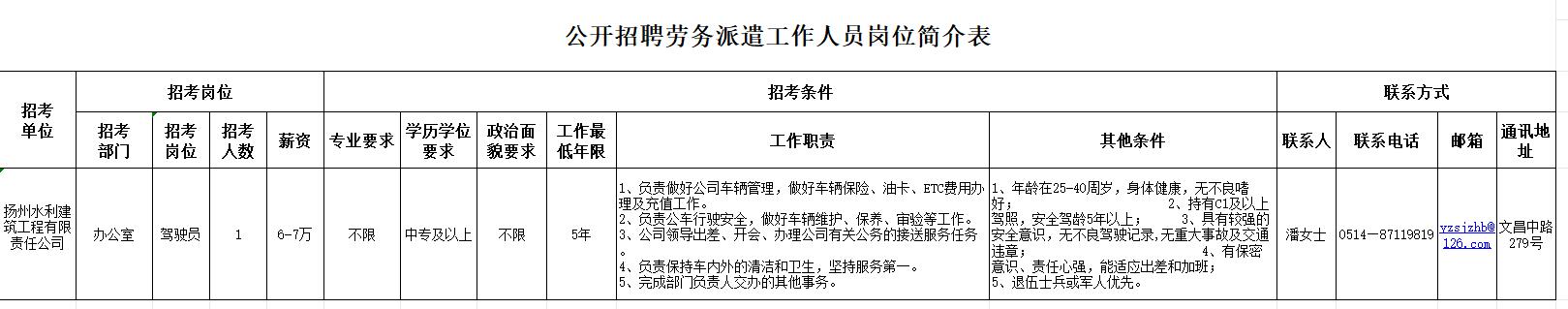 2023年揚(yáng)州水利建筑工程有限責(zé)任公司 招聘勞務(wù)派遣工作人員公告